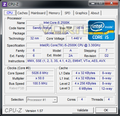 With overclocking simplified on Sandy Bridge, this means that achieving the best overclock couldn't be easier. CPU voltage and multiplier just need to be modified accordingly. The ultimate milestone is 5GHz on air cooling for the Intel Core i5 2500K and so I didn’t hang about, nudging the multiplier up to 50 I soon came up against a brick wall at 1.3v – so I began modifying the voltage to cater for the large overclock until at last when I hit 1.45v the system would boot into Windows and was verified as being stable after an adequate amount of passes within LinX.