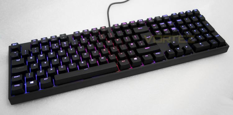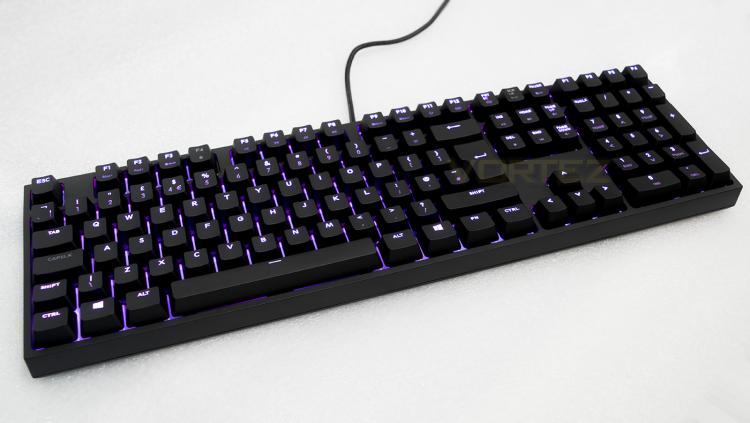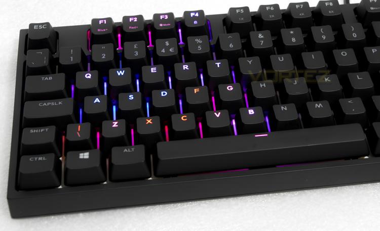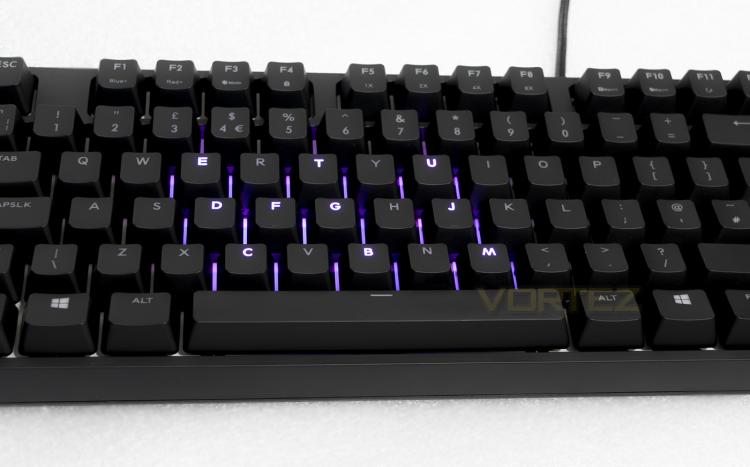 The Cooler Master Quick Fire XTi features customisable per key back lighting using red/blue LEDs, while seemingly limited compared to a full RGB keyboard, it does give a distinct character.
