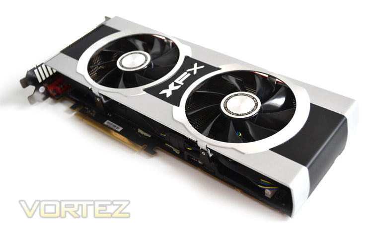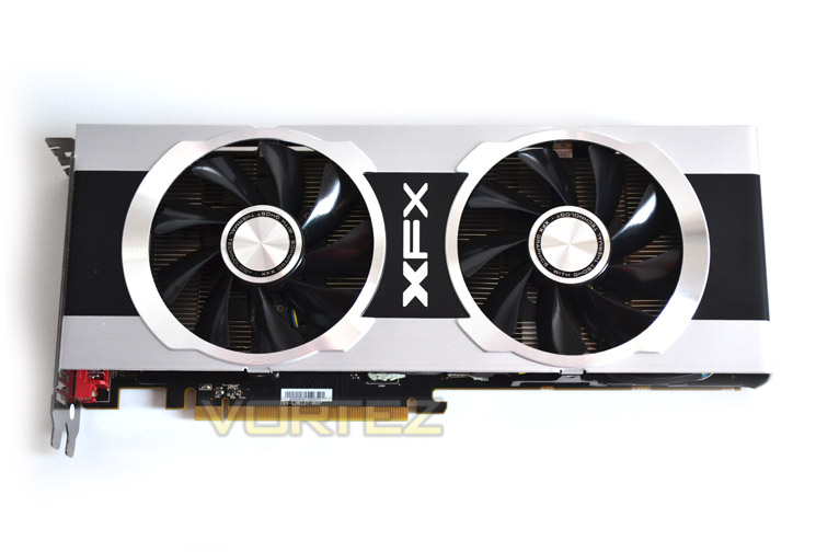 This card is a stunner. The silver and black shroud with raised brushed aluminium shroud is quality throughout and contrasts really well with the glossy black twin 92mm fans separated by the XFX logo in the coolers midriff. The cooler is folded very well at the ends with no sharp edges to be found and rather than using flimsy plastic, the metal should stand the test of time no matter how many times the card is removed/replaced.