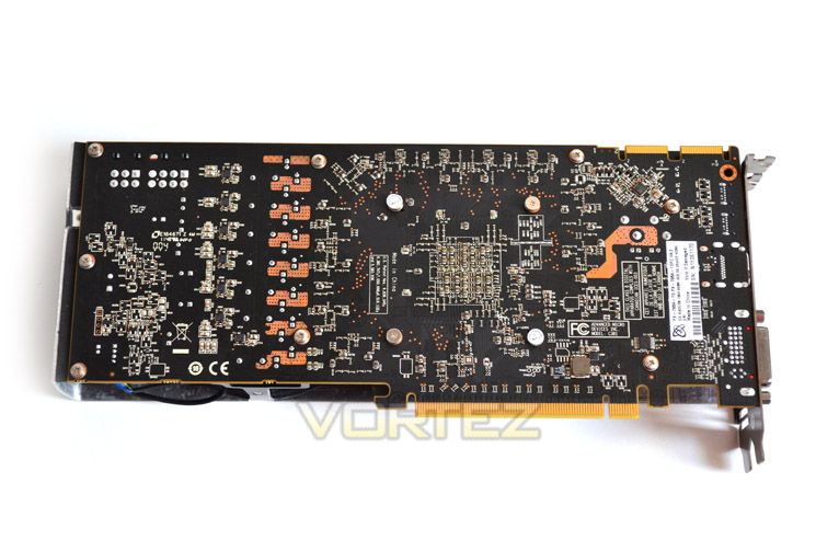 The rear of the card shows us that this is no ordinary HD7950 with the PCB having flecks of copper contrasting with the matt black PCB not previously seen on a HD7950. It is interesting that the PCIe power area has 8 points solder where there are 6 pins hinting that this is the same PCB used on the R7970 which uses an 8+6 pin power configuration.