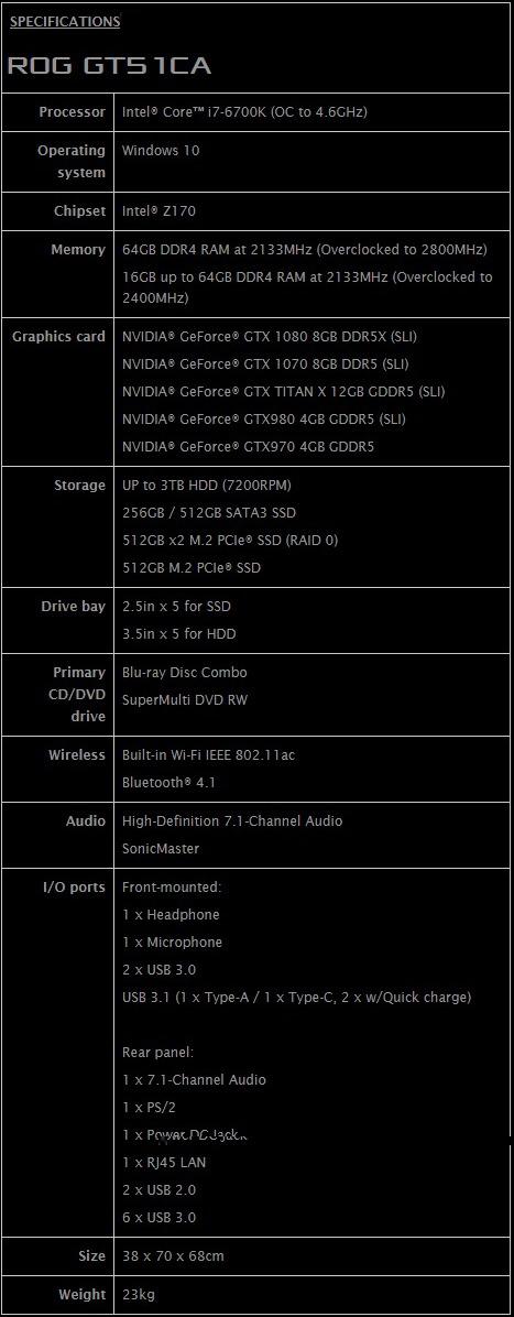 The ROG GT51CA can now come with the new NVIDIA GeForce GTX 1080 graphics cards, supporting up to two GTX 1080s in 2-Way SLI configuration for a super-smooth and stunning 4K UHD gaming resolution. This setup performed 60% better to the 2-Way SLI GTX 980 setup of the GT51CA.